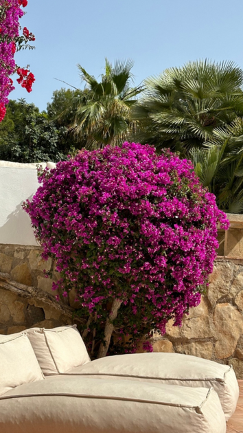 De zithoek is de ideale plek om je dag te beginnen met een kopje koffie of af te sluiten met een gezellige borrel. Verder biedt het een prachtig uitzicht op de zonsondergang, waarbij de roze bougainvillea en de oranje lucht samen een betoverende sfeer creëren.